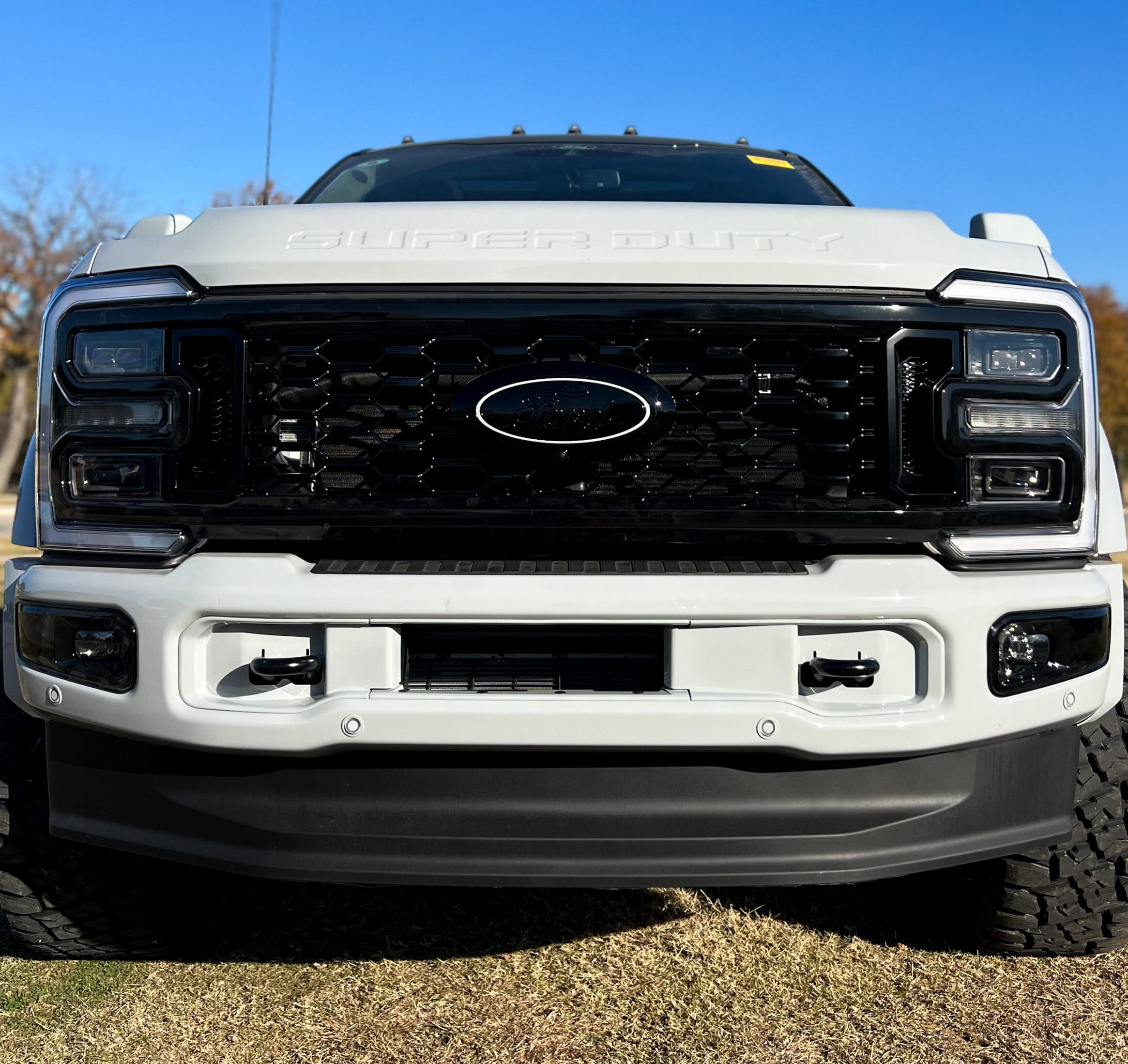 For those who prefer a more aggressive, modern appearance, a full chrome delete has been applied to this F-450 Platinum. All chrome accents—grille, badges, mirror caps, and door handles—have been swapped for matte black or body-colored pieces.