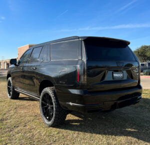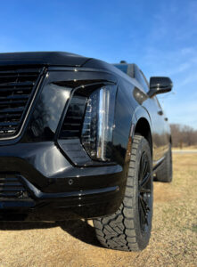 Finishing off the build is XPEL Ultimate Plus ceramic window tint, providing both functional benefits and visual refinement. Ceramic tint dramatically reduces interior heat, blocks harmful UV rays, and protects the leather and digital screens that make the Cadillac Escalade cabin so luxurious. The darker glass adds privacy for passengers and enhances the exterior’s black-on-black theme. Beyond comfort, it’s an investment in long-term protection, ensuring this custom SUV stays as pristine inside as it looks on the outside.