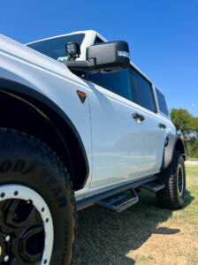 Lighting is one of the most essential upgrades for any off-road enthusiast, and the Rigid Industries ditch lights make a noticeable difference the moment the sun goes down. Mounted on the A-pillars, these lights provide unmatched illumination at wide angles, helping drivers see obstacles, wildlife, and terrain changes far beyond what factory headlights cover. Known for their durability and weather resistance, Rigid Industries lights are built to perform in the toughest conditions, ensuring that this Ford Bronco can take on trails at night with complete confidence. Whether it’s cutting through desert dust or thick forest shadows, these ditch lights turn every off-road adventure into a safer, more controlled experience.