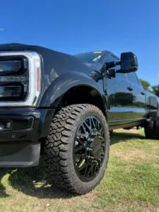 No blackout build would be complete without the right wheel and tire setup, and this Ford F-450 delivers in a big way. Sitting on a stunning set of JTX Forged wheels, this truck wears its attitude proudly. These wheels are not only engineered for extreme strength, but they also bring a level of visual craftsmanship that sets them apart from mass-produced alternatives. Precision-cut from forged aluminum, they offer reduced unsprung weight and increased durability—perfect for a truck that’s expected to perform. Wrapped around these powerhouse wheels are Fury Country Hunter R/T tires, which blend the best traits of rugged off-road traction with the smooth ride of a highway tire. These tires are built for versatility, offering confident performance whether you’re climbing a muddy trail or towing a heavy load on the interstate. Together, the wheels and tires provide unmatched performance, both on-road and off.