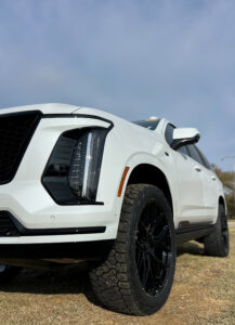 To complement the upgraded wheels, this Cadillac Escalade is equipped with Nitto Recon Grappler tires—one of the most versatile hybrid-terrain tires available. These tires are designed to thrive in a variety of environments, offering a confident grip on both pavement and rougher surfaces. Their advanced tread pattern provides stability during highway cruising, ensuring minimal road noise and a comfortable ride, which is essential for a luxury SUV. At the same time, their rugged construction means they can handle dirt roads, gravel, and light off-road conditions without hesitation. The Recon Grapplers also enhance the vehicle’s overall look with their aggressive sidewall design, giving the Cadillac Escalade a more capable and powerful appearance.