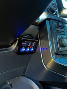 Whether it’s a late-night trail run or a foggy backroad, visibility is never a concern thanks to the Rigid SR Pro 30” light bar and Rigid flood pod lights. The light bar delivers an intense forward beam, cutting through the night with crisp white illumination, while the flood pods expand the lighting zone to the sides, ensuring no obstacle goes unseen. Controlled by a 6-gang auxiliary switch panel, these lights can be toggled with ease—giving the driver complete control at their fingertips.