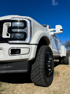Paired with the American Force wheels are Nitto Recon Grappler tires, known for their ability to perform in a wide range of driving conditions. These tires strike the perfect balance between aggressive off-road capability and refined on-road comfort. The advanced tread design provides confident traction on dirt, gravel, and uneven terrain while maintaining excellent stability and reduced road noise on pavement. Visually, the Recon Grapplers add a rugged edge that complements the Ford F-450’s heavy-duty nature, making this truck look just as capable as it performs.