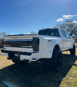 The smoked tail lights and side markers add a subtle yet impactful upgrade to the exterior of this Ford F-450. By darkening these factory components, the truck achieves a more aggressive and streamlined look that enhances its overall aesthetic. These lighting upgrades help eliminate bright factory colors, allowing the design of the truck to flow seamlessly from front to back. The result is a cleaner, more modern appearance that complements the truck’s size and stance without overwhelming its rugged character.