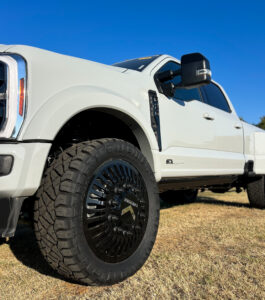 One of the most eye-catching features of this build is the set of KG1 forged wheels. Forged wheels are known for their superior strength-to-weight ratio, created by compressing and shaping metal under extreme pressure to eliminate imperfections and maximize durability. This manufacturing process results in wheels that are not only lighter than cast wheels but also much stronger—perfect for a truck that’s expected to endure rough terrains and heavy loads without compromising performance. The KG1 wheels add an aggressive stance and a modern touch to the Ford F-450’s look, with their bold lines and precision craftsmanship complementing the truck’s muscular frame. Beyond aesthetics, these wheels improve handling and reduce unsprung weight, contributing to a smoother ride and better fuel efficiency. When paired with the other performance upgrades, the KG1 forged wheels ensure that this F-450 looks and performs at the top of its class.
