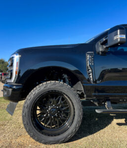 One of the most noticeable upgrades on this build is the leveling kit, which corrects the factory rake and gives the Ford F-250 a strong, even stance. This modification isn’t just about looks—it’s about function. By lifting the front end, the leveling kit allows for better clearance, improved approach angles, and the ability to accommodate larger tires without compromising ride quality. The improved geometry gives the truck a more assertive posture, enhancing stability whether you’re towing, hauling, or just driving down the highway. It’s the kind of upgrade that subtly transforms the truck’s overall feel—balancing performance with presence. The end result is a setup that rides as confidently as it looks, offering smooth handling and durability that matches the truck’s power under the hood.