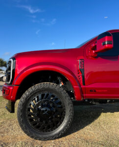 The leveling kit installed on this Ford F-450 provides more than just visual appeal—it enhances the overall balance and usability of the truck. By eliminating the factory rake, the front and rear now sit at an even height, giving the truck a level, squared-off posture that emphasizes its impressive size. This upgrade also improves front-end clearance, creating better approach angles and enabling the truck to more confidently navigate uneven terrain or steep driveway angles. The improved stance pairs seamlessly with the larger wheels and tires, resulting in a more aggressive yet functional profile that feels both intentional and engineered for real-world use.