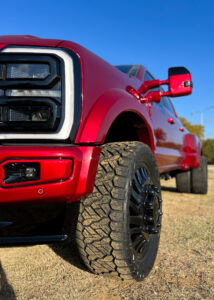 Paired with those premium wheels are Nitto Recon Grappler tires, a hybrid terrain option that balances off-road ruggedness with impressive on-road refinement. These tires are designed with an innovative tread pattern that provides dependable grip in dirt, gravel, rain, and highway conditions, making them a trusted choice for both work applications and everyday driving. The reinforced construction ensures stability under heavy loads, while the quieter-than-expected road noise makes long trips far more enjoyable. Their aggressive sidewall styling enhances the truck’s overall look, giving the Ford F-450 a tough, ready-for-anything edge that perfectly complements the wheels and suspension upgrades.