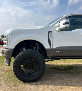 The transformation begins with a McGaughy’s 4-inch lift kit, a premium suspension upgrade known for both quality and ride comfort. This lift not only gives the Ford F-250 the aggressive height and ground clearance it deserves, but it also enhances its overall drivability. The additional clearance makes it easier for the truck to tackle uneven terrain, deep ruts, and off-road obstacles while still maintaining smooth handling on pavement. McGaughy’s engineering ensures that the truck stays stable and composed, even with the added height, offering drivers a more confident and controlled experience whether they’re cruising down the highway or exploring back roads. It’s a foundational upgrade that sets the tone for the rest of the build.