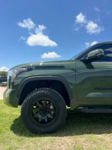 The foundation of this Toyota Tundra build starts with a leveling kit—a subtle but essential modification that corrects the Tundra’s factory rake (the nose-down look from the front). By lifting the front end by about 2–2.5 inches, this kit provides a level and aggressive stance that not only enhances appearance but also improves functionality. The extra clearance helps fit larger tires without rubbing and allows for better approach angles when off-roading. Plus, it contributes to a more commanding presence on the road. Whether towing, hauling, or hitting a mountain trail, the leveled stance provides a noticeable boost in both form and function.